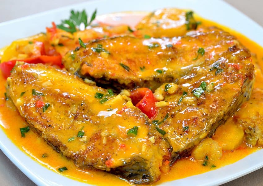 Junte os camarões na panela com os legumes, coloque o leite de coco, e o azeite de dendê, depois acrescente as postas em cima dos legumes, cozinhe por mais 3 minutos. Desligue o fogo e finalize com o cheiro verde.